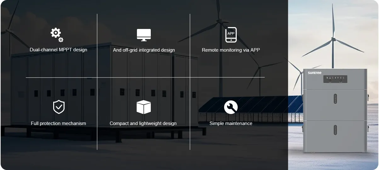 • Protección contra sobretensión/sobretemperatura de la batería, sobretensión/sobrecorriente fotovoltaica, reducción/protección de la carga por sobretemperatura del inversor, protección contra voltaje/frecuencia anormal de la red, y protección contra sobrecarga/cortocircuito de la salida de CA.
